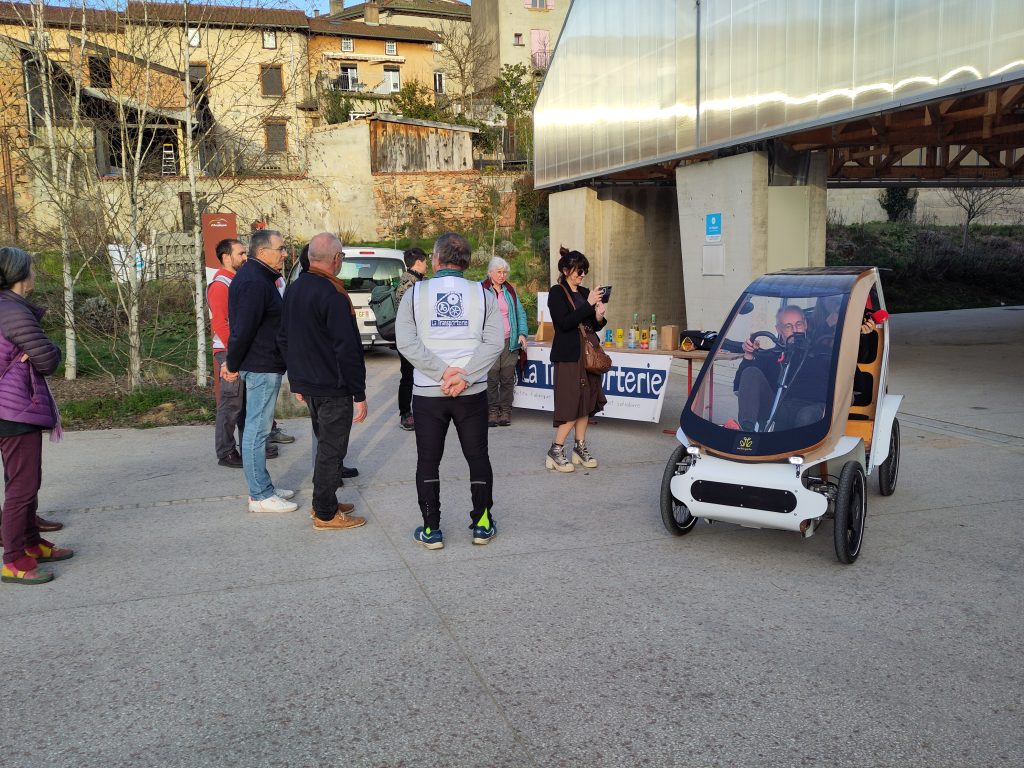 Dans une ambiance conviviale, l’équipe de l’association, ainsi que le constructeur Acticycle a expliqué l’objectif de ce premier mois d’expérimentation, et le projet plus long terme que nous souhaitons déployer sur le territoire : tester pendant 3 ans des véhicules intermédiaires avec les habitants et les acteurs du territoires, pour valider leur pertinence et identifier le meilleur moyen de mettre à disposition ces véhicules.